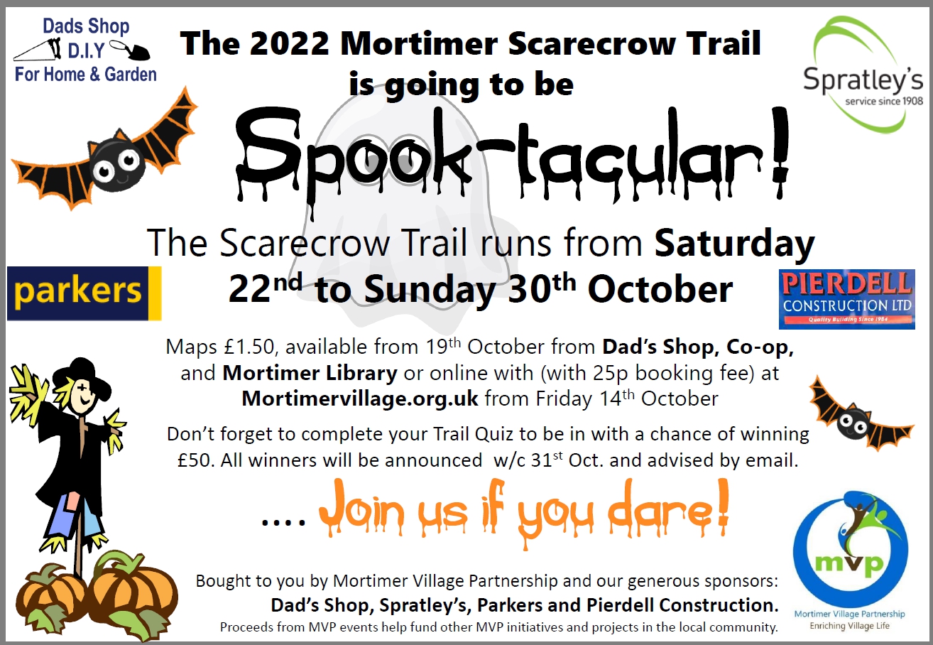 Come and visit the 2022 MVP Mortimer Scarecrow Trail. 17 Scarecrows based on our Spooktacular theme. All in easy walking distance around the Centre of the village just use the map to make sure you don’t miss any!